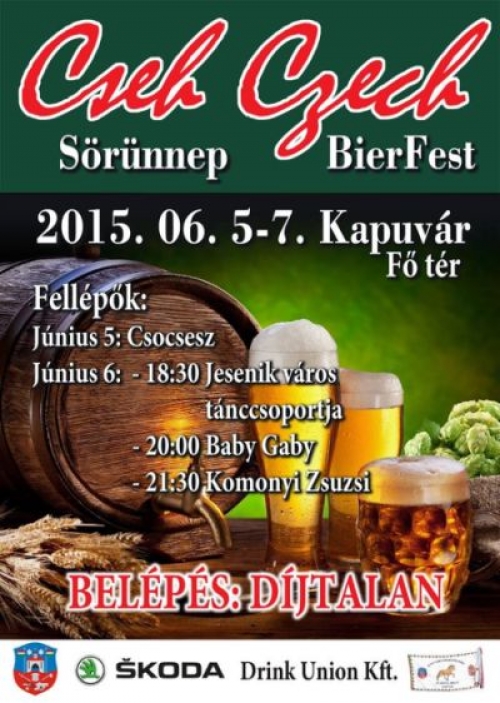Idén is Cseh Sörnapok Kapuváron! Részletes program :.... Műsor: Június 5. Péntek 17.00 nyitótánc a Junior Mozgásstudióval 17.10 megnyitó Hámori György polgármesterrel és a cseh nagykövetség képviselőjével 17.25 a Junior Mozgásstudió tánc bemutatója 20.00 a Luca és a Happy End zenél 21.00 Csocsesz műsora 21.30 - 02.00 Luca és a Happy End zenél Június 6. Szombat Délelőtt főzőverseny a kisebbik várárokban Közben a Hanyi Íjászok bemutatója 18.00 Moovement Dance Scool modern tánc bemutató 18.30 Jesenik (Csehország) város tánccsoportja 20.00 Baby Gaby énekel 20.30 Royal Duo zenél 21.30 Komonyi Zsuzsi énekel 22.00 - 02.00 Royal Duo zenél Június 7. Vasárnap 16.00 A Fabula együttes koncertje, csak kicsiknek és nagyoknak 17.00 Maminbaba - hordozós latin fitnesstorna bemutató A programok Kapuváron a várárok szabadtéri színpadán lesznek. A rendezvény INGYENES!Twitter