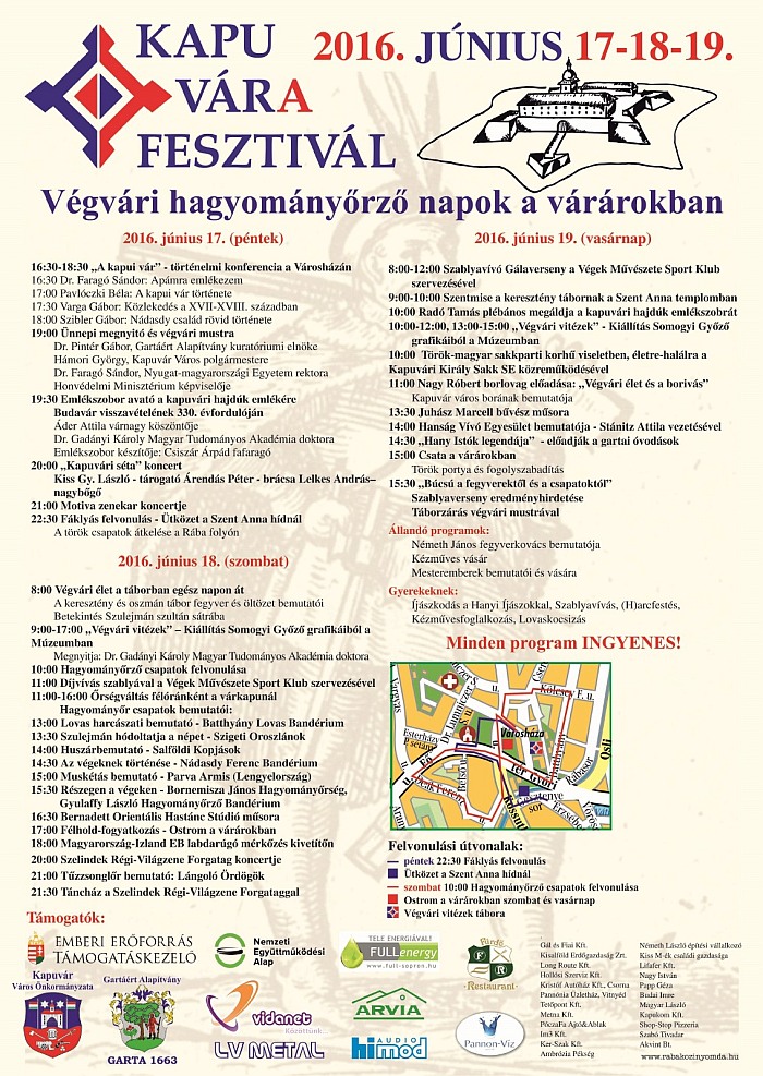 Első alkalommal rendezik városunkban a Kapu Vára Fesztivált. A három napos rendezvényen igazán sűrű program vár a kapuváriakra, és az idelátogatókra. Csaták, háborúk, bajvívások elevenednek majd meg ezen a hétvégén a várárokban. Természetesen az időjárást is úgy rendezték, hogy minden a legtökéletesebb legyen. Íme a program: Twitter