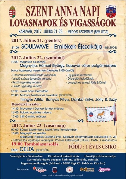 Idén is a lovasoké a főszerep a kapuvári búcsúkor. Természetesen nemcsak a MEDOSZ pályán lesznek programok, hanem vasárnap a Várgödörben is várják majd az érdeklődőket a szervezők. Programok a MEDOSZ pályán 2017.07.21. Péntek Este : Emlékek Éjszakája Koncert 2017.07.22. Szombat -- Lovas versenyek - 10.00 : Megnyitó + Kezdés - Lovas verseny kategóriák : 1. Futószáras bemutató 2. Vezető száras ügyességi verseny 3. Kezdő ügyességi verseny 4. Haladó ügyességi verseny - 16.00 : Lovas Harci Bemutató 5. Kezdő díjugratás 6. Haladó díjugratás 7. Ride & Drive /lovaglás és autó vezetés - A versenyen mindenki saját felelősségére indul Az időpontok a nevezések függvényében változhatnak. - A sátorban napközben kulturális műsorok - 20.00 : Mulatós - Tilinger Attila - Bunyós Pityu - Dankó Szilvi - Jolly & Suzy - Lovas Bál: West együttesTwitter