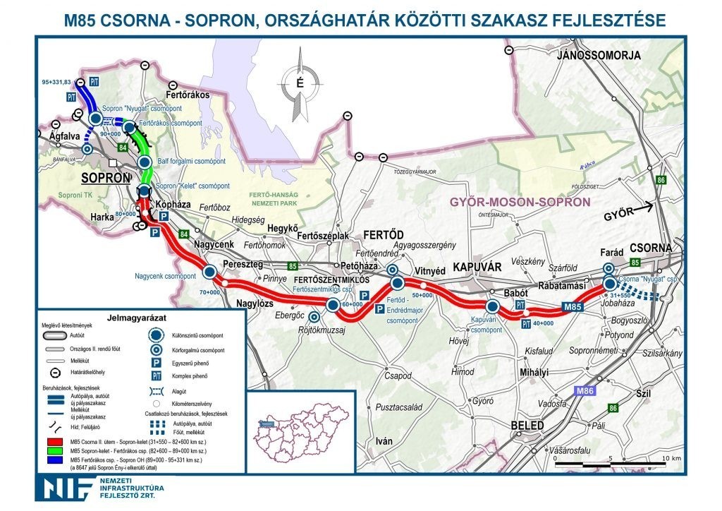A kedvező időjárásnak köszönhetően már nagy lendülettel folynak a nagytömegű földmunkák az M85-ösön. Az összesen 57,5 kilométer hosszú, négy részprojektben megépülő 2x2 sávos útvonalon. A Csorna és a Fertőd-Endrédmajor csomópont közötti 20,05 kilométert a Strabag Építő Kft., a Strabag AG és a Belfry PE Kft. konzorciuma építi fel. a további szakaszok munkálatait pedig az EuroAszfalt Kft., a Swietelsky Magyarország Kft. és a Betonútépítő Zrt. alkotta társulás végzi el egy másik soproni szakaszt a Dömper Kft. és a Subterra-Raab Kft. alakítja ki. Twitter