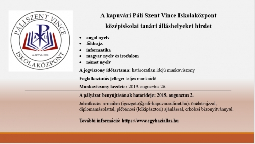 2019. szeptemberétől az egykori Felsőbüki Nagy Pál Gimnázium már a Páli Szent Vince Katolikus Iskola tagintézményeként kezdi meg működését a diákok számára. Az új rendszerű iskolában szükség van új tanerőkre, ezért a Katolikus Iskola az alábbi képesítéssel rendelkező tanárok jelentkezését várja 2019. augusztus 2-ig. :