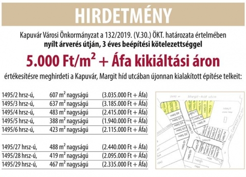 Liciten kínálja árverésre Kapuvár Város Önkormányzata a Margit híd utcában kialakított építési telkeket, 2019. szeptember 16-án hétfőn 10 órai kezdettel. Az egykori Húsgyár területéhez tartozó részen kezdetben 8 később további 20 építési telket kínálnak árverés útján az építkezni vágyók számára értékesíteni. Kapuvár VárosiÖnkormányzata 132/2019.(V.30.) ÖKT. határozata értelmében nyílt árverés útján, 3 éves beépítési kötelezettséggel 5.000 Ft/m²+ Áfa kikiáltási áron értékesítésre meghirdeti aKapuvár, Margit híd utcában újonnan kialakított sorházas beépítésű építése telkeit: 1495/2 hrsz-ú, 607 m² nagyságú (3.035.000 Ft + Áfa)1495/3 hrsz-ú, 637 m² nagyságú (3.185.000 Ft + Áfa)1495/4 hrsz-ú, 483m² nagyságú (2.415.000 Ft + Áfa)1495/5 hrsz-ú, 388m² nagyságú (1.940.000 Ft + Áfa)1495/6 hrsz-ú, 423 m² nagyságú (2.115.000 Ft + Áfa)1495/27 hrsz-ú, 488 m² nagyságú(2.440.000 Ft + Áfa)1495/28 hrsz-ú, 419 m² nagyságú (2.095.000 Ft + Áfa)1495/29 hrsz-ú, 467 m² nagyságú(2.335.000 Ft + Áfa) Az építési telkek egyenként kerülnek árverésre. Az árverésre magánszemélyek jelentkezhetnek, egy magánszemély egy építési telket vásárolhat. Az árverések résztvevőinek az árverés megkezdéséig 150.000Ft összeget szerződéskötési biztosíték, illetve bánatpénz jogcímén letétbe kell helyezniük a Polgármesteri Hivatal pénztárában. Tájékoztatom az érdeklődőket, hogy a terület korábbi hasznosítása miatt feltöltött, az alapozási módot ennek megfelelően kell megválasztani. Az árverésen az vehet részt, aki részvételi szándékát 2019. szeptember13. (péntek) 12.00 óráig írásbanjelezte a Polgármesteri Hivatal 17. sz. irodájában. Az árveréssel kapcsolatban érdeklődni a 96/596-000/117 számú telefonon, illetve személyesen a Polgármesteri Hivatal 17. számú irodájában lehet Az árverések ideje: 2019. szeptember 16./hétfő/: 10.00 óra Az árverések helye: Kapuvári Polgármesteri Hivatal kistanácskozó terme.Twitter