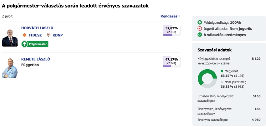 Kapuvár új polgármestere: Horváth László, a FIDESZ - KDNP jelöltje. Szoros "küzdelemben" 282 szavazattal szerzett többet, mint vetélytársa, Remete László Független jelölt. A helyi önkormányzati választáson Kapuvár város 8129 szavazatra jogosult választó polgára közül 5176 fő jelent meg. (63,67%) Az urnába 5165 lebélyegzett szavazólap került. 4980 érvényes szavazat volt, és mindössze 185 érvénytelen. Horváth László: 2631 szavazatot, (52,83%) míg vetélytársa Remete László: 2349 (47,17%) jelölést kapott. A képviselő testület összetételéről még nincs érdemleges hír. Addig is gratulálunk Horváth László polgármester úrnak, aki 2024. októbertől fogja betölteni pozícióját. Twitter