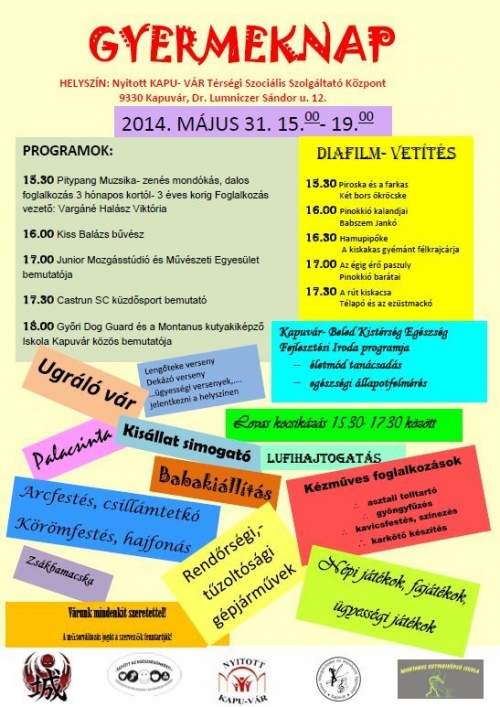A kapuvári gyermeknap programja, mely május 31-én, a Családsegítő Intézet szervezésében kerül megrendezésre