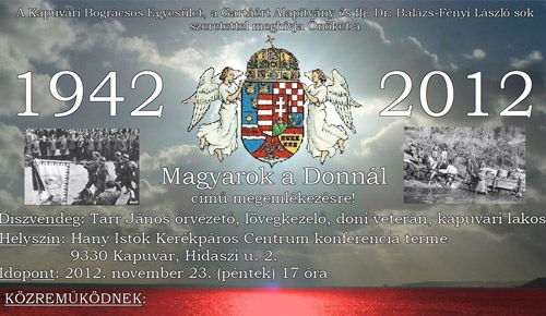 A Kapuvári Bográcsos Egyesület, a Gartáért Alapítvány. és ifj. Balázs-Fényi László szervezésében kerül sor 2012. november 23-án péntek 17:00-tól a Magyarok a Donnál 1942 - 2012 c. előadás Helyszín: Hany-Istók Kerékpáros Centrum konferencia terme. Twitter
