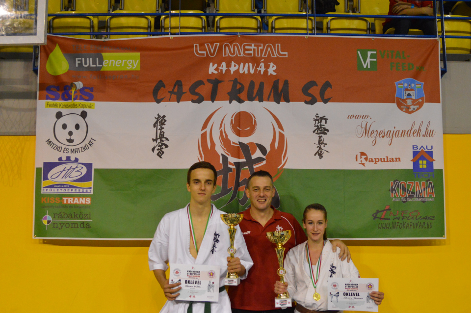 12 Kyokushin Karate szervezet, 40 egyesületének több mint 400 indulója közt két Castrumos sportoló szerepelt, és mindketten elhozták az MKSZ (Magyar Karate Szövetség) Magyar Bajnoki címét. Németh Veronika, és Németh Márk aranyérmesek. Az MKSZ Utánpótlás Magyar Bajnokságára, a XVIII. Bushido Kupán két Castrumos karatéka indult. Viszont mindketten hozták az elvárható maximumot. Németh Veronika, és Németh Márk is Magyar Bajnokként ünnepelhették a szombat estéjüket. Az ifjúsági -80 kg-os súlycsoportban Németh Márk orvosolta legutóbbi (Sysman Open) "ballépését", és villámgyors fejrúgásaival sorra aratta a győzelmeket, és vívta ki csoportjában az aranyérmet. Németh Veronika a junior női -55 kg-ban - most már mondhatni szokásosan profi teljesítményt nyújtott, és birtokolja ismét a Magyar Bajnoki címet is. Mivel a 18 éves vitnyédi sportoló a november 27-28-i U22-es Kyokushin Európa Bajnokságra készül, ezért edzője Pantelics Péter, a versenyen túl, 2 Super Fight-ot kért számára. Az elsőben a junior -65 kg-os budapesti Fori Henriettát győzte le, majd rövid pihenőt követően, a fehérvári Kreitl Kittivel vívtak látványos küzdelmet, ahol szintén győzedelmeskedett. A Castrum SC köszöni támogatóinak, a segítséget és a sikereikben való részvételt! Németh Márk - Pantelics Péter - Németh VeronikaTwitter