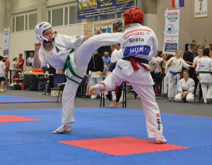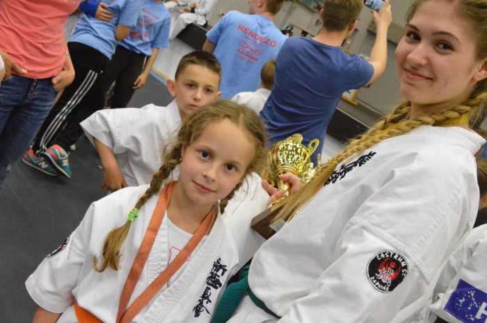 A Castrum SC Kapuvár utánpótlás versenyzői Tatán, a XXI. J&S Speed Kupa Országos Kyokushin Karate Bajnokságon szerepeltek, és hozták az érmeket városunkba. Sensei Pantelics Péter bevetette a legfiatalabb versenyzőit is. Ezúttal 2 arany-, 1 ezüst- és 1 bronzérem lett a kapuvári karatésok eredménye. Három ország (Szlovákia, Horvát-, és Magyarország) 41 klubjának 465 nevezője 5 küzdőtéren harcoltak a bajnoki címekért. A 8 fős Castrumos versenyzői gárda remek csapatmunkában dolgozott. A tapasztalt, most már több Európa Bajnoki címmel rendelkező junior versenyzők nem feledték milyen volt, mikor ők voltak kezdő Gyerek-I-es harcos palánták. Folyamatosan segítették a fiatalokat, és igyekezték oldani azok izgulását. Kisebb-nagyobb sikerrel. Gyermek I-ben Virág bronzérmet szerzett A Castrum SC legfiatalabb versenyzője Németh Virág még csak 8 éves, de már kiérdemelte első országos bronzérmét teljesítményével! Az elődöntőben volt némi pontelszámolás, a Castrumos versenyző hátrányára, de igaziból nem is az érmek csillogása, mind inkább a minél többszöri tatamira lépés volt a célja ennek a napnak. Szücs Hanna, Nyikos Eszter és Németh Jankó derekasan helytálltak, de ahhoz, hogy dobogóra léphessenek, előbb saját magukat kell legyőzniük. Izgulásuk, ólomsúlyként tartotta vissza őket remek formájuktó. Hoffer András a serdülő csoportban nem igazán a pontszerzésre törekedett. Ő inkább a folyamatos küzdelmet szerette volna felvállalni, amit ez a szabályrendszer mág kevésbé támogat. Ennek ellenére harciassága további sikereinek alapját képezi a Castrum utánpótlásában. Castrumos junior hölgyek előtt nem lehet megállni A küzdelmek során a junior női versenyzők szépen osztották a wazarikat, ipponokat. Bán Lili a női könnyűsúlyban, míg Végerbauer Roberta a női nehézsúlyban állhatott a dobogó legmagasabb fokára. Pantelics Bence ezúttal a junior férfi KATA versenyt kihasználva készül a nyári danvizsgájára, ahol ezüstérmével bizonyította remek technikai felkészülését. - Jó volt látni a legfiatalabb versenyzőinket is az országos mezőnyben harcolni. Virág ügyesen kamatoztatta a tanultakat, míg a többieknek le kell győzniük az izgulást, ha dobogóra szeretnének állni. Hamarosan ez is sikerülni fog! Ebben nagy segítségemre vannak Európa bajnok versenyzőim, akik nagy gonddal figyelnek kisebb társaikra. Büszke vagyok minden Castrumos harcosra. Junior Erópa Bajnok hölgyeim konkrét feladatot kaptak, és a versenyhelyzetben is sikeresen alkalmazták az itthon gyakorolt új kombinációkat! – mondta Sensei Pantelics Péter a Castrum edzője A Castrumban még nincs vége a versenyidőszaknak! Június és július is nemzetközi kihívásokkal várja az élversenyzőket! 2017. július 1-2-án Németh Veronika a 6. Súlycsoportos Világbajnokságon Kazahsztánban, Európa Válogatottként képviseli a Rábaközt a világ legjobb 32 női karatésa közt!Erről hamarosan bővebben is hírt adunk! A Castrum SC Kapuvár elnöksége, köszöni támogatóiknak, hogy ezen a nívós országos versenyen is segítették a csapatot! Twitter