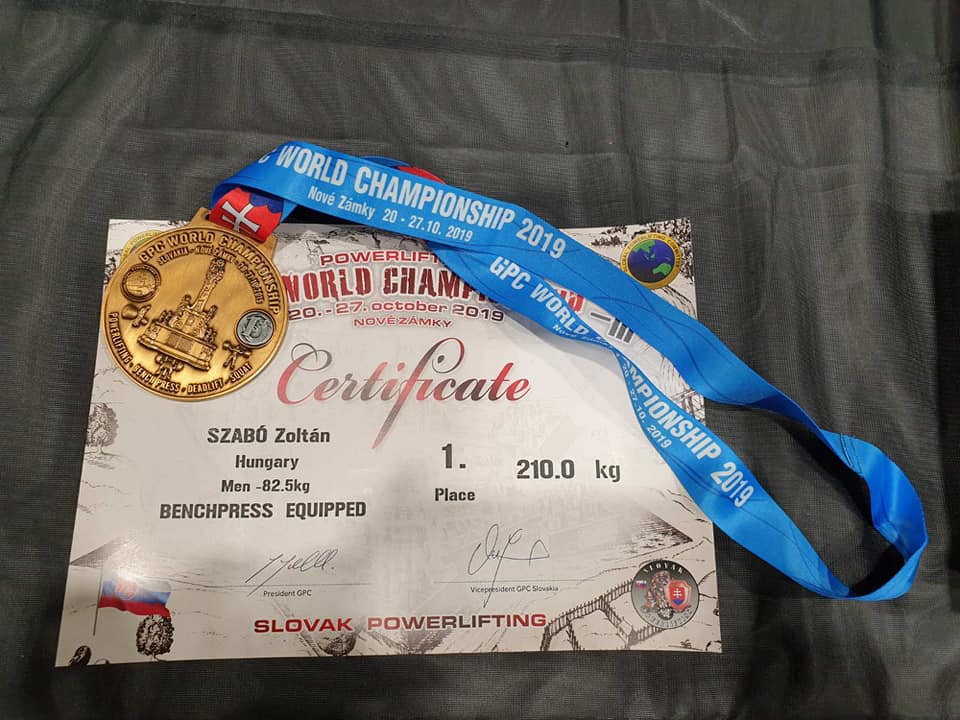 Zoli súlycsoportjában a legnagyobb súlyt nyomta ki, amivel sikerült megszereznie a VB  aranyérmet.