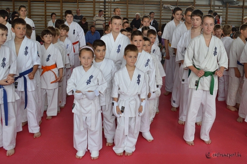 A márciusi havazás miatt elmaradt I. Griff Patent Kupa Gyermeknap hétvégéjén lett megrendezve Pápán. A versenyen 117 karatés közt 29 Castrumos harcos indult. A legfiatalabb előkészítő csoport ugyanúgy megmérettette magát, minnd a tapsztalt ifi-, serdülő korosztály. 15 arany-, 4 ezüst-, 10 bronzérem és egy vidám gyereknapi fürdőzés zárta a napot. Az utánpótlás korúak legfiatalabbjai első versenyükön mérettették meg magukat. A súly-,kor- és tapasztalat alapján kialakított csoportokban a fiatal karatékák egyenlő képességű társaikkal mérkőzhettek meg. A pár könnycsepp ami legördült, az nem a fizikai fájdalom, hanem inkább az elkeseredésnek szólt, ha valami épp nem úgy sikeredett. A családias hangulatú versenyen 9 dunántúli Shinkyokushin karate klub mérte össze magát két küzdőpáston. A legfiatalabbak teljes védőfelszerelésben (testpajzs, altest-, ököl-, sípcsont- és fejvédő) küzdöttek, míg az ifik szerényebb protektorokat használva ízelítőt adtak a nézőknek, hogy miért ERŐ KARATÉNAK hívják a Kyokushint. Az előkészítő csapatból voltak, akik hamar elkapták a fonalat, és sorra gyűjtötték a pontokat. Néhányunknak viszont a helyzet, a felszerelés, az "izgalom koktél" összetétele nem igazán hozta még ki kapuvári formájukat. A tapasztalt versenyzők egy országos versenynél nyugodtabb környezetben próbálhatták beépíteni tanult technikáikat, amit Jerkó Dominik, Szalai Sámuel, Zsoldos Patrik, Orbán Bence klasszul kiviteleztek. A tapasztalt serdülő csapat a korábbi II. osztályú szabályrendszerben (Testpajzs nélkül, sípcsont-, altest- és fejvédő használatával Ippon (1 pont) -ig menő két perces küzdelemben, ahol a bírók a tiszta, szabályos fejrúgásokat, valamint a test KO-t értékelik Wazari (félpont)-val, illetve Ipponnal.) Mind a fiúk, mind a lányok derekasan helyt álltak. A barátság egyedül a Végerbauer Roberta - Németh Veronika küzdelemben volt érezhető, ahol a két lány inkább egy Kyokushin bemutató küzdelmet produkált, maximálisan vigyázva a másikra. A hosszabbítással kiegészített küzdelemben végül az 50 kg-os Németh Veronikát látták jobbnak a bírák. Veronika, a nála 10 -15 kg-val nehezebb ellenfelekkel is állta a sarat, és győzedelmeskedett gyors fejrúgásaival. A puszataszbolcsi Horváth Ramónát viszont egy olyan szögből, teljesen tisztán találta fejbe, amitől a lány megszédült. A bírók leléptették a vitnyédi gimnazistát, még akkor is, ha az vissza húzta a lábát. Sajnos a rúgás tempója, ereje, és tisztasága egy hajszálnyival többre sikerült a megengedettnél. Veronika bár legyőzte mind a három vetélytársát, mégis a pontok, és szabályok szerint csak a III. helyre állhatott. A serdülő fiúk ügyesen helyt álltak, és alkalmazkodtak a szabályrendszerhez. Papp Dániel az ifi csoportban, még a comb rúgásokat is bevállalta, és kétszer is győzedelmeskedett idősebb társainál. Zuber Krisztián pontatlansága, görcsössége a közös edzések hiányát tükrözte. Papp Győző villám gyors lába és keze pontosan célba ért. Hol jodan wazarikkal, hol pedig chudan KO-val győzedelmeskedett.Kovács Róbert kicsit nehezen módosította a pontrendszeres küzdelmi stílusát, de mikor ráébredt, hogy itt a bírók máshogy ítélnek, hamarosan alkalmazkodott. Pantelics Bence 565 nap után vállalta újra a küzdelmet, és igazán jó volt nézni, ahogy Önnön magán aratott győzelmével társain is sikerült felülkerekednie. Várpalotai ellenfelét végig hajtotta. A Bódi Sport féle rácsos sisak igazán jól bizonyított, mert több véletlen fejütéstől is megóvta.Németh Márkkal egy nagyon pergős küzdelmet produkáltak, ahol a két Castrumos fiú megmutatta, hogy a 2014-es Ifi mezőnyben számítani kell velük. Márk első küzdelmét Körmendi Adrián ellen elkapkodta, és pontatlansága miatt, lényegében ő okozta magának a vereséget. Bencével már jól ismerték egymást, így szinte előre érezték a másik mozdulatait. Gimnazista társának végül sikerült őt két fejrúgással is meglepni. A sikeres nap megkoronázásaként a csapat nagy része elfoglalta a pápai Várkert fürdőt, és egészen záróráig dorbézoltak. Castrumos helyezettek: Papp Csongor Kapuvár, Castrum 1. Előkészítő / Fiú / Kezdő 1 Pintér Roland Kapuvár, Castrum 1. Előkészítő / Fiú / Kezdő 3 Jerkó Dominik Kapuvár, Castrum 1. Gyerek 1 / Fiú / Haladó 1 Németh Raul Kapuvár, Castrum 1. Gyerek 1 / Fiú / Kezdő 1 Nyikos Dávid Kapuvár, Castrum 1. Gyerek 1 / Fiú / Kezdő 4 Zsoldos Patrik Kapuvár, Castrum 1. Gyerek 1 / Fiú / Kezdő 5 Borsodi Endre Kapuvár, Castrum 1. Gyerek 1 / Fiú / Kezdő 6 Kiss Benedikta Kapuvár, Castrum 1. Gyerek 1 / Lány / Kezdő 2 Szalai Sámuel Kapuvár, Castrum 1. Gyerek 2 / Fiú / Haladó 1 Orbán Bence Kapuvár, Castrum 1. Gyerek 2 / Fiú / Kezdő 3 Végerbauer Roberta Kapuvár, Castrum 1. Ifi / Lány Papp Győző Kapuvár, Castrum 1. KO Serdülő / Fiú / 1 Pantelics Bence Kapuvár, Castrum 1. KO Serdülő / Fiú / 2 Papp Dániel Kapuvár, Castrum 1. KO Serdülő / Fiú / 3 Bán Lili Kapuvár, Castrum 1. Serdülő / Lány / Kezdő Szalai Benedek Kapuvár, Castrum 2. Előkészítő / Fiú / Kezdő 2 Dezamics Bence Kapuvár, Castrum 2. Gyerek 1 / Fiú / Kezdő 2 Dezamics Máté Kapuvár, Castrum 2. Gyerek 2 / Fiú / Haladó 4 Zuber Krisztián Kapuvár, Castrum 2. KO Serdülő / Fiú / 3 Németh Zalán Kapuvár, Castrum 3. Előkészítő / Fiú / Kezdő 4 Kiss Milán Kapuvár, Castrum 3. Gyerek 2 / Fiú / Haladó 3 Dukai Norbert Kapuvár, Castrum 3. Gyerek 2 / Fiú / Kezdő 3 Molnár Brigitta Kapuvár, Castrum 3. Gyerek 2 / Lány / Kezdő Németh Veronika Kapuvár, Castrum 3. Ifi / Lány Kovács Róbert Kapuvár, Castrum 3. KO Serdülő / Fiú / 1 Németh Márk Kapuvár, Castrum 3. KO Serdülő / Fiú / 2 Nyikos Bernát Kapuv