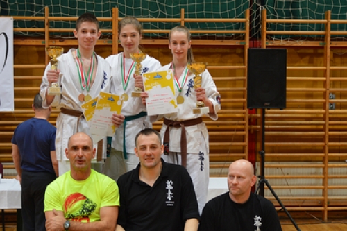 67 klub, majd 600 versenyzője közt 15 Castrumos karatés indult a veszprémi Kyokushin Karate Diákolimpia döntőben. 3 aranyérem, 3 ezüt- és 3 bronzérem volt a nap jutalma. A várpalotai elődöntőből továbbjutott 15 karatés március 21-én Veszprémben küzdhetett meg társaikkal. A hat küzdőpáston folyó viadalok folyamatos elfoglaltságot biztosítottak dr. Szalai László, Németh Gábor és Pantelics Péter edzőhármasnak. A versenyt a formagyakorlat versenyszámok nyitották. Pantelics Bence az ifjúsági férfi mezőnyből igyekezett (13 fő) az elsők közé. A dobogó harmadik fokára léphetett. A KATA versenyt követően egyből kezdődtek a Gyerek I. és II. küzdelmek. Míg a Gyerek I-es csoportban Szalai Benedek, addig a Gyerek II. korcsoportban Jerkó Dominik vívott kemény csatákat. Mindketten ezüstérmet szereztek.Németh Gábor edzői utasításokat ad Dominiknek Fábián Orsolya a Gyermek II. női mezőnyben szerezte meg a bronzérmet teljesítményével, míg Dukai Norbertnek a Serdülő fiú abszolut kategóriában sikerült ugyanez. A pergős nap során az Ifik szinte egyszerre küzdöttek a tatamikon. Míg Bán Lili mögött Németh Gábor serénykedett, addig Pantelics Bence küzdelmeiben édesapja volt a segítő. Lilinek a döntőben nem sikerült győznie. Yakuzás ellenfele mögött a dobogó 2. foka, és a csillogó ezütérem várta. Miközben Bence vívta a csatáit a 6-os tatamin (18 fő versenyzett az ifi -70 kg-ban), addig Végerbauer Roberta az 5-ös tatamira volt hivatalos. Küzdelem - küzdelem hátán, győzelem - győzelem hátán. Pantelics Bence és Végerbauer Roberta is szépen remekeltek, és diákolimpiai aranyérmet mindketten megérdemelték. Tét az Európa Bajnoki kvalifikáció Németh Veronika a junior női -55 kg-ban remekelt, és mindhárom küzdelmát iponnal nyerte. Aranyérmével biztosította helyét az áprilisi Kyokushin Európa Bajnokság női csapatában. Castrumos eredmények: Gy.I.ffi 36kg: II. Szalai Benedek Castrum Gy.II.ffi 35kg: II. Jerkó Dominik Castrum Gy.II.női 45kg: III. Fábián Orsolya Castrum Srd.ffi +70kg: III.Dukai Norbert CastrumCastrumos bajnokok Ifj.ffi 70kg: I. Pantelics Bence Castrum Ifj.női 60kg: II. Bán Lili Castrum Ifj.női+60kg: I. Végerbauer Roberta Castrum Jun.női 55kg: I. Németh Veronika Castrum Ifj. ffi kata: III. Pantelics Bence Castrum Twitter